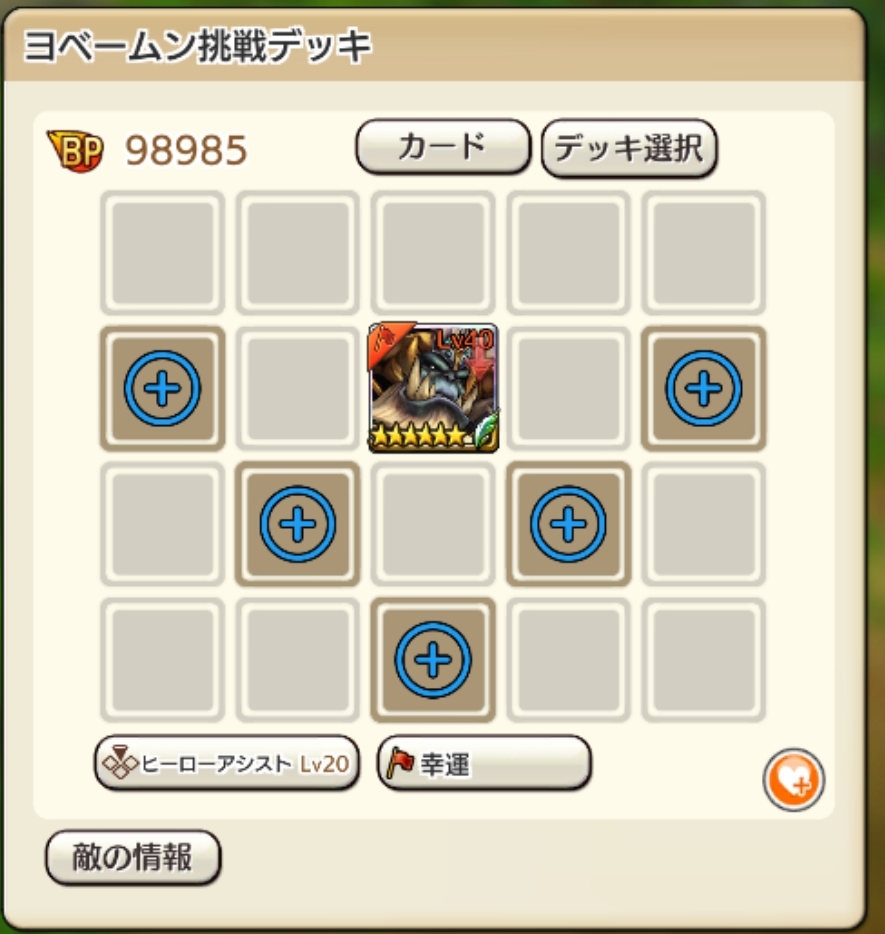 ただ、コイン稼ぎの面ではソロであってもオススメです。現状の繰り返しクエストが(復刻を除く)30回勝利だけであり、端末によるが一周するのに10~15分かかるため、圧倒的にヨベームンの方が時間短縮できます(コインの量も多く、御守りもドロップするため一石二鳥、但し追加で繰り返しクエストが実装された場合は評価が変わる)