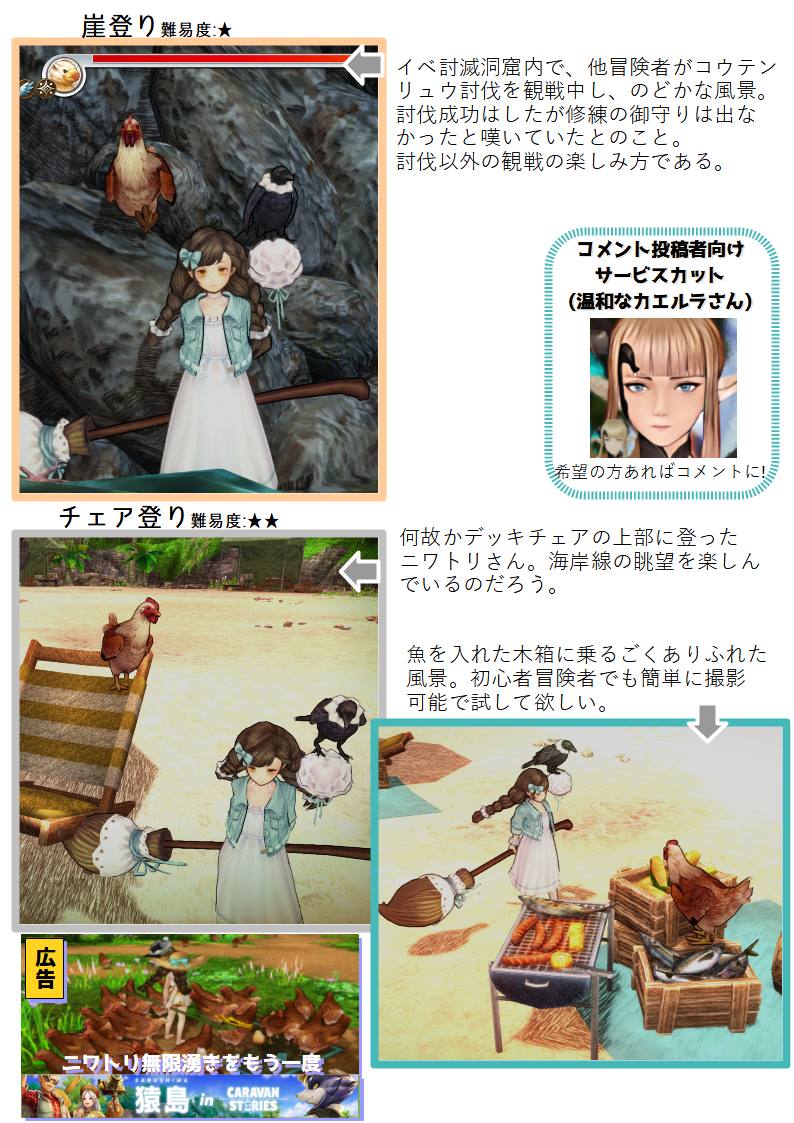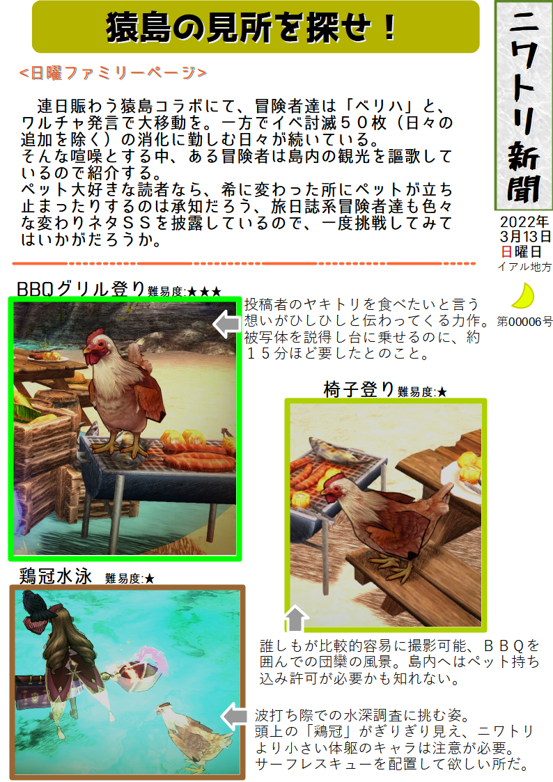 2022/03/13 12:40 公開 ニワトリ新聞第6号 雑日誌 日曜日なので、社会・経済面はさておき・・・日曜ご家族向け版 ■バックナンバー ニワトリ新聞第5号 https://masters.caravan-stories.com/posts/jfkjhykd みのわん リンクをコピーしました 前の旅日誌 旅日誌一覧 次の旅日誌 コメント 1 エイル ID: akd8vgv9iz87 かっ、カエルラさんが!! ありがとうございます\(^o^)/カタオモイ代表キャラのストーリーで魅せるおバカエルラさんの喜怒哀楽は見ものですねグリルに登ったらその。。ヤキトリになっちゃいませんか。。? 2022/03/13 13:59 2 白兎 ID: qww5zqc879zu 心頭滅却しているニワトリさんがいる! 2022/03/13 19:14 3 みのわん ID: 8jj5xywimtku >> 1 投稿者のルヴレさんは・・・ヤクトリ好き。(ルヴレとニワトリシリーズの第1話から!)(*´∀`*)https://masters.caravan-stories.com/posts/zfrykyv 2022/03/14 16:16 4 みのわん ID: 8jj5xywimtku >> 2 焼かれ慣れているので、これぐらいの火力では大丈夫かと~!ビーストのライバルは「サンショウウオ」さん。練習バトルも幾度となく・・ 2022/03/14 16:18