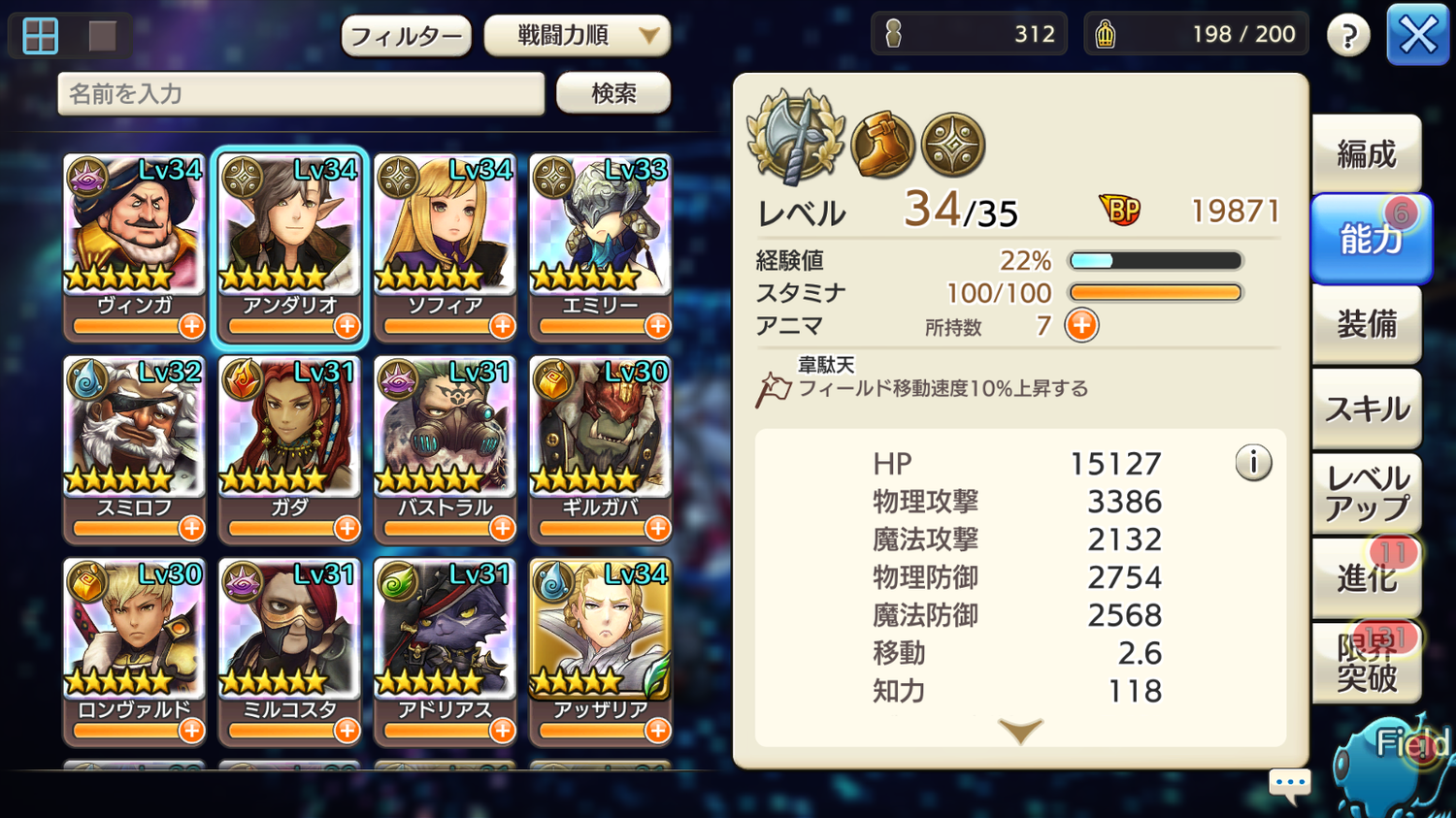 で、いまアンダリオの能力を確認してみたら、Lv34→Lv35までの経験値が、4日で22%貯まってたんですよ。あれ、思ってたよりも早いペースかも・・・。