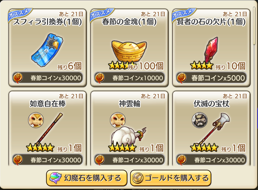 2021/02/02 21:24 公開 えぐくない?もとは無料だよね? 雑日誌 春節交換アイテム、全部取らせる気がないように見える。クエあったらほぼ無料でもらえたのにこんなのあんまりだ!! ヤマト リンクをコピーしました 前の旅日誌 旅日誌一覧 次の旅日誌 コメント 1 柊朱鷺 ID: ugj8eu8z6bpb 奈落の交換アイテムにメダル1個で交換できるコイン袋が追加されていますのでそちらを試してみてはいかがでしょうか(すみませんが私はまだ開けてないのでどれぐらいコイン手に入るかわかりません)。 2021/02/02 21:27 2 ヒメクイナ ID: z7pxunh8thkb ハッカイの☆5サブだけでも頑張って手に入れれば…チャットでアイコンを変えて遊べます! 2021/02/02 22:26