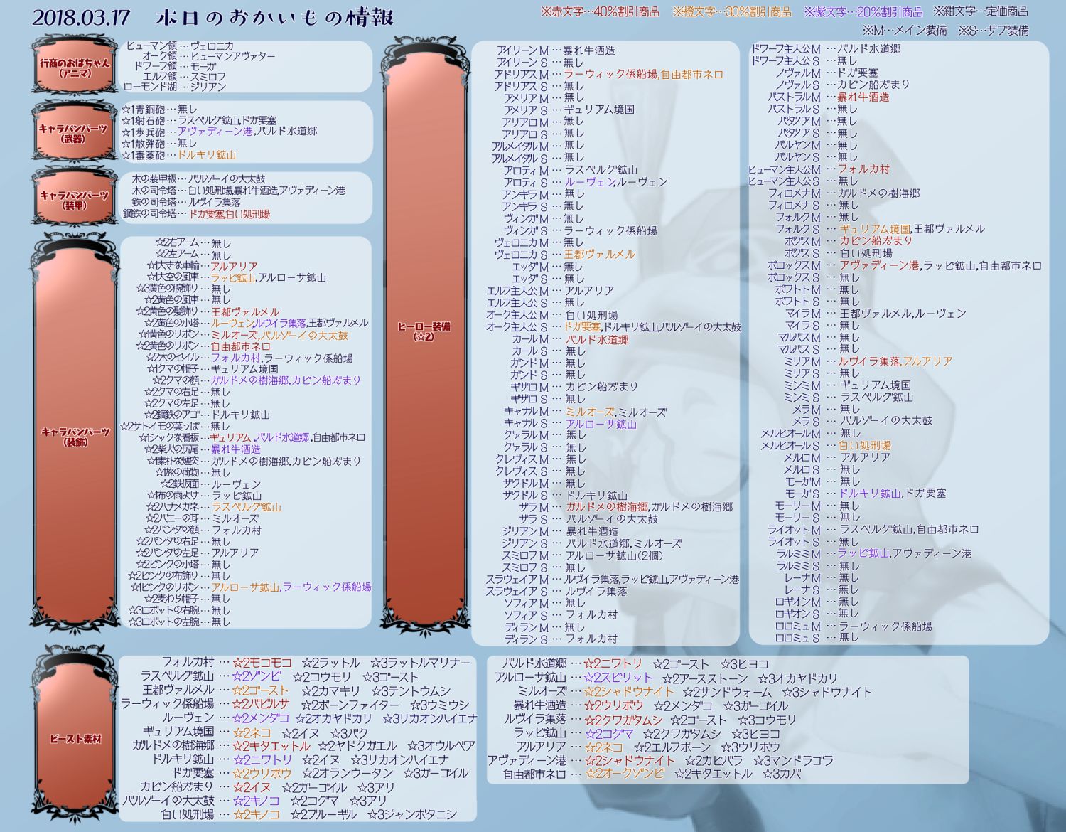 2018/03/17 01:47 公開 今日のおかいもの情報*\(^o^)/* <<<覚醒ルーンは自由都市ネロで販売中!!>>>今日は40%OFF鋼鉄の司令塔が2個買えます~*\(^o^)/*あとはわりと装飾多めかな??? マーシャーク リンクをコピーしました 前の旅日誌 旅日誌一覧 次の旅日誌 コメント 1 Charmia ID: b5x89fykdqv7 最近は装備買い占めて星3装備作って修練したりもするようになりました(^-^) 2018/03/17 07:57 2 ニャムC ID: 5vuw69uv69nb いつも大変ありがとうございます。とても助かります(・ω・)ノ 2018/03/17 15:27 3 マーシャーク ID: hu7xijr63c3v >> 1 おかねもち…!!!! 2018/03/18 10:41 4 マーシャーク ID: hu7xijr63c3v >> 2 いえいえ~!お役にたてれば何よりですよ~*\(^o^)/* 2018/03/18 10:42