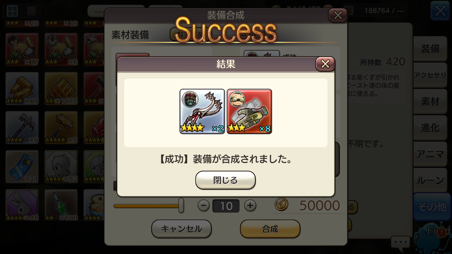 金武器できたら2本目合成するよりも、私なら他のキャラの武器の材料に回したい、って思うのだけど・・・。