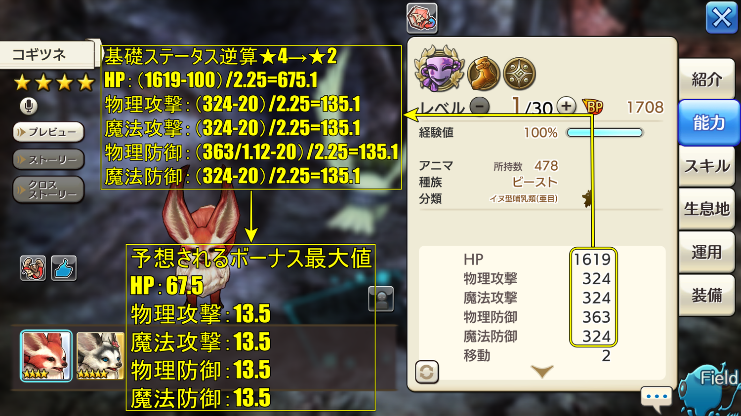 今回の素体は★4ですのでボーナス値の予想はいつも通り図鑑からの逆算になりました。テイムも割とすんなり行った気がします。あまり苦労しなかった印象。