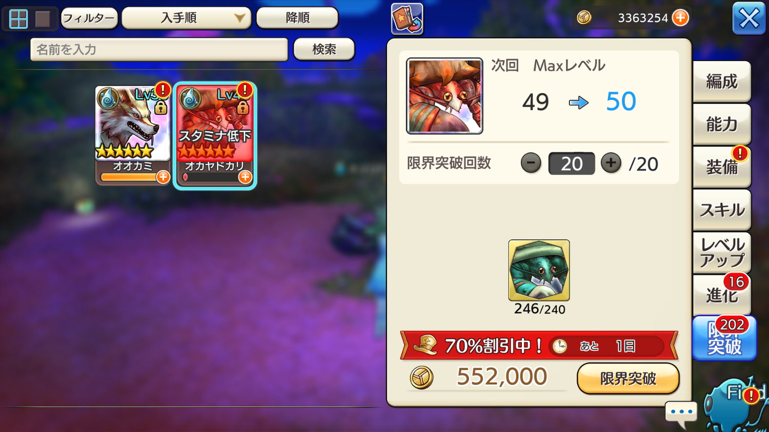 本来ならイベントビーストを完凸させるべきだったのでしょうが、今回はオカヤドカリを50まで凸させることに成功しました。