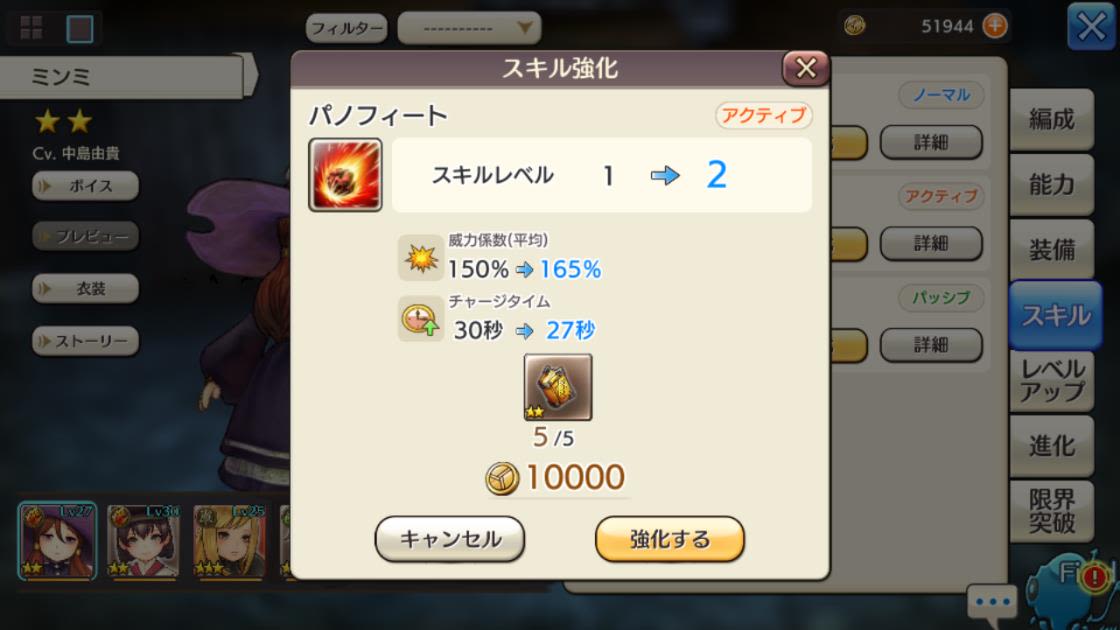 英雄の試練にチャレンジして、キャラバンの交換所で、戦技指南書(初級)を交換してもらえたので、レーナちゃん、ミンミちゃん、マルバス君のアクティブスキルを2にアップしたよ~~~