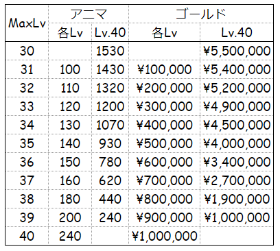 3列目・5列目は現在のMAXレベルから限凸MAX(レベル40)までに必要なアニマとゴールドです。
