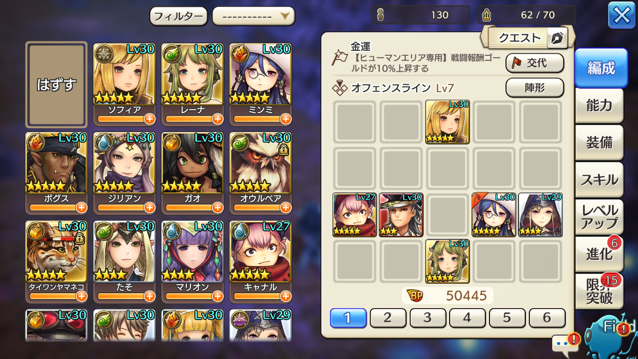 耐えるだけなら☆4のキャナルやソフィアにザラでも足せば充分でしたが、そうなると火力が足りずに時間切れ。なのでキャナルの☆5進化を待ってクリアまでこぎつけましたが、正直火力(と操作)が微妙だったせいもあると思います。