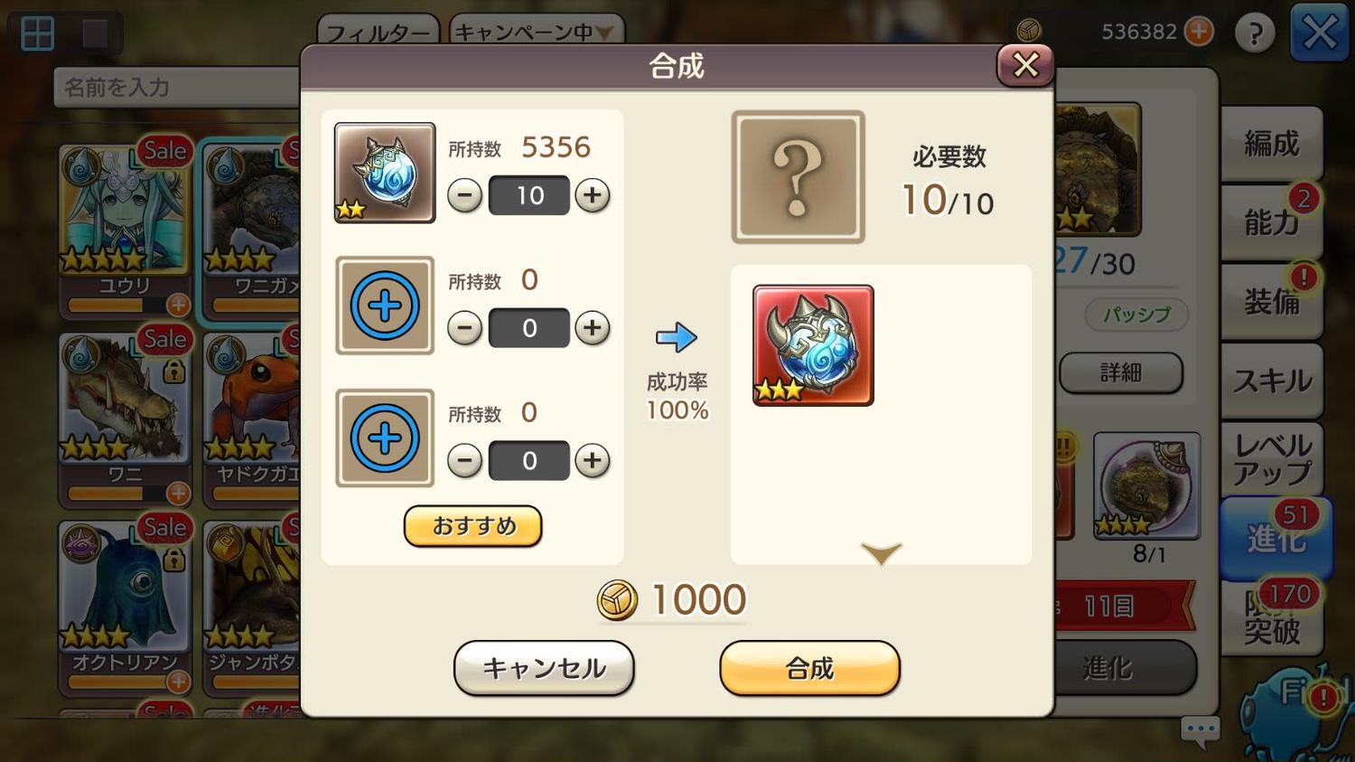 ビ中珠が数千個あるので、キャンペーン対象を進化させまくるだけのビ大珠は多分足りるんじゃないかと思ってるのですが、こうですね、何百回も合成するなら、合成大成功の確率とか統計とるにはいいかもしれませんね。めんどくさいので、私にはできませんけど。