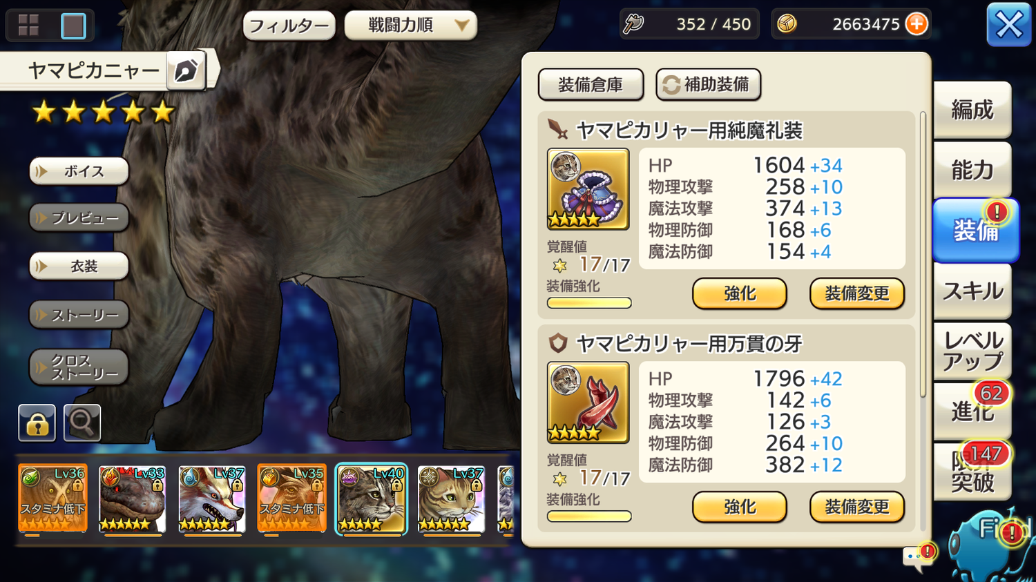 貯めこんでた☆2~4の装備をすべてつぎ込み、補助枠に入れていた☆4達を全部剥がし、溶かして溶かして溶かしつくしてやっとこさ成功。