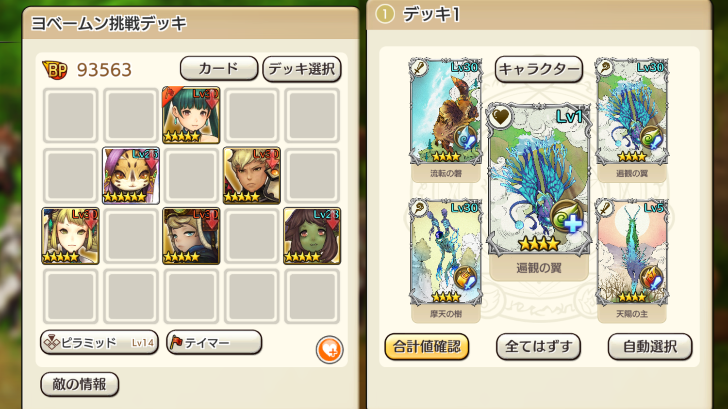 以下、自分なりの攻略です。もちろん英雄や限定キャラは使っていません。「こんな方法で倒した奴がいるんだなぁ」みたいに思っていただければ。画像から分かる通り貧弱なパーティですが意外となんとかなりました。回復を補強しようとダメージ吸収のカードをセットしましたが、必要なかったような気もします。