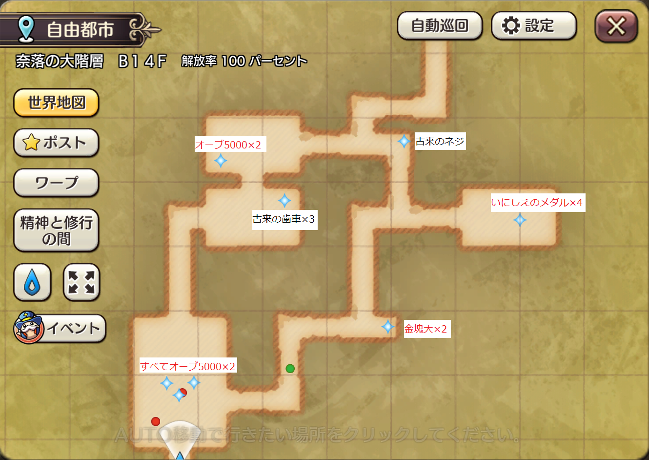 2020/01/19 03:24 公開 アイテムマップ(奈落B14F~B16F) スクリーンショット 今さら感はありますが、次回開催時に取り残しのないようにマップを作りました。ときどき落ちてるものが見えないときがあって、倉庫を圧迫するものを拾いに行ってしまい、パーティメンバーを待たせることが多いものでwここの雑魚はメダルも落とすけど、キャラバン素材だけのことも多い印象です。トレジャーストーンはメダル4個と宝珠大や覚醒ルーンを落とすので、ねらってるんですがなかなか…w シャサ リンクをコピーしました 前の旅日誌 旅日誌一覧 次の旅日誌 コメント