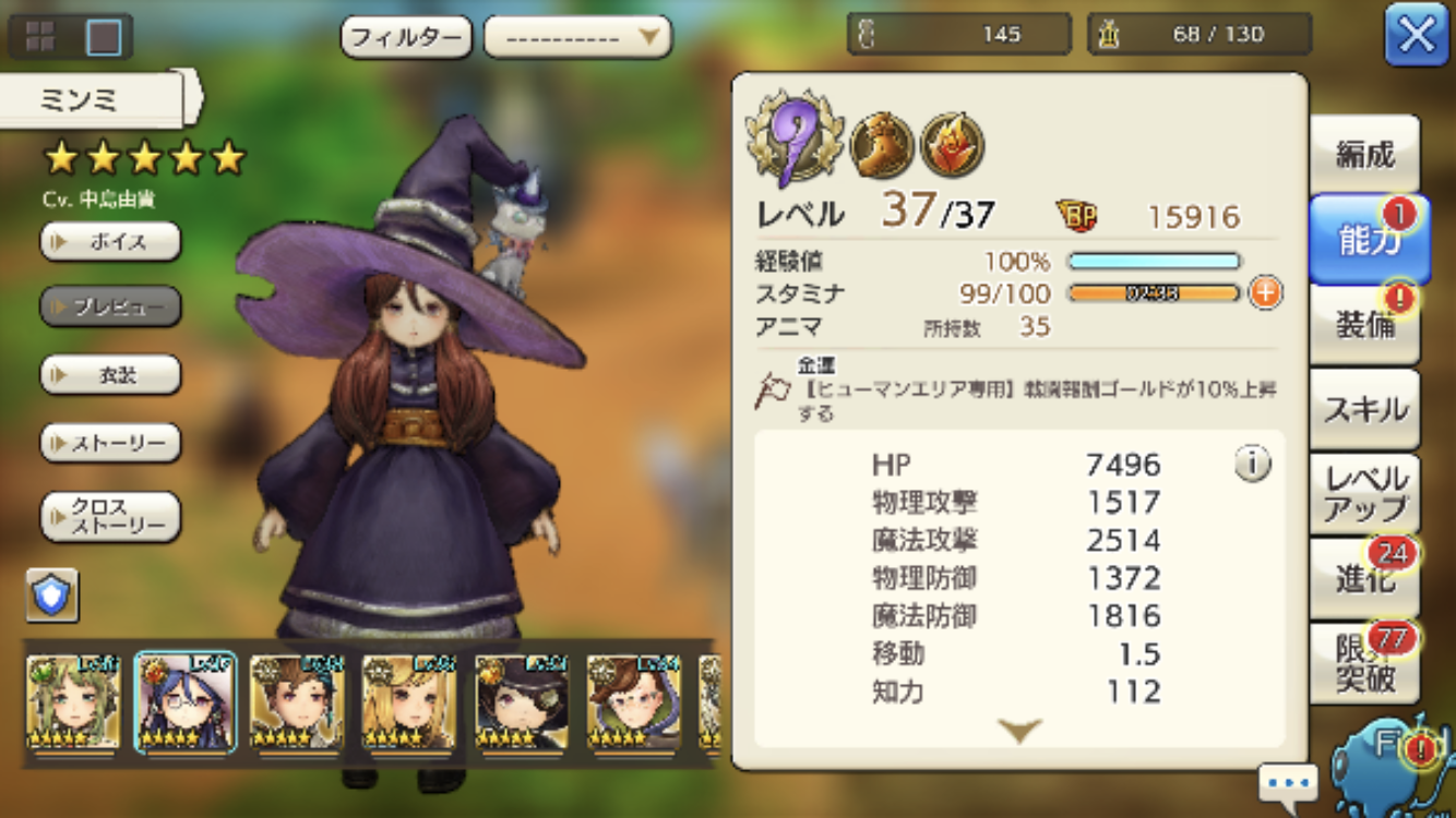 ※ミンミの能力値の写真を貼り付けました。