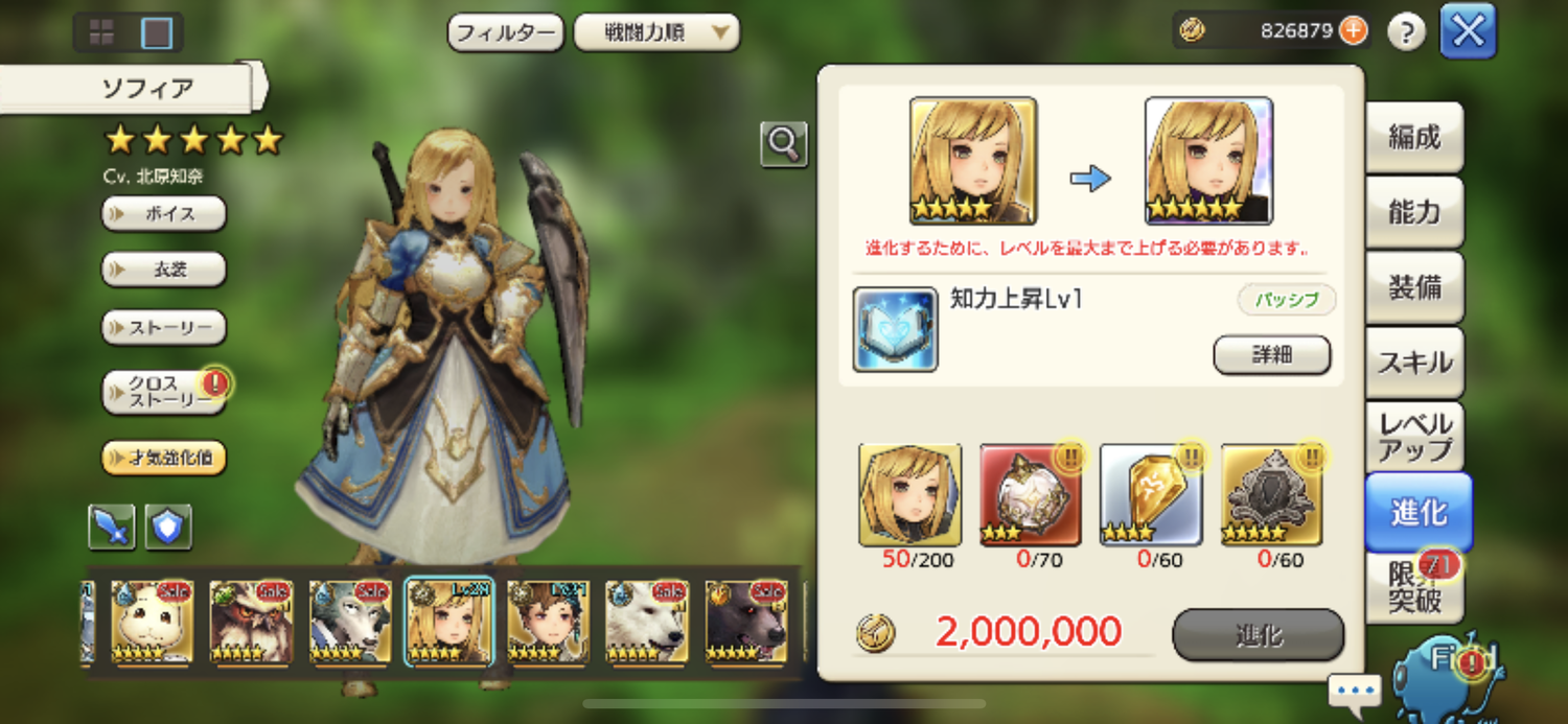 私の記憶では昨年でやっと星4まで進化させることができ、ソフィアのクエストをクリアした記憶がありますが、進化の素材とゴールドが中々集まらなかった問題があり、星5へ進化させるのに、時間がかなりかかりました。
