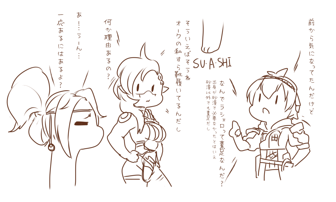 リザードマンは砂漠エリア在住で靴なくてもいいかなぁ…というか靴履いてたら砂が入ってしゃーないだろうなぁってんでわかるんだけど