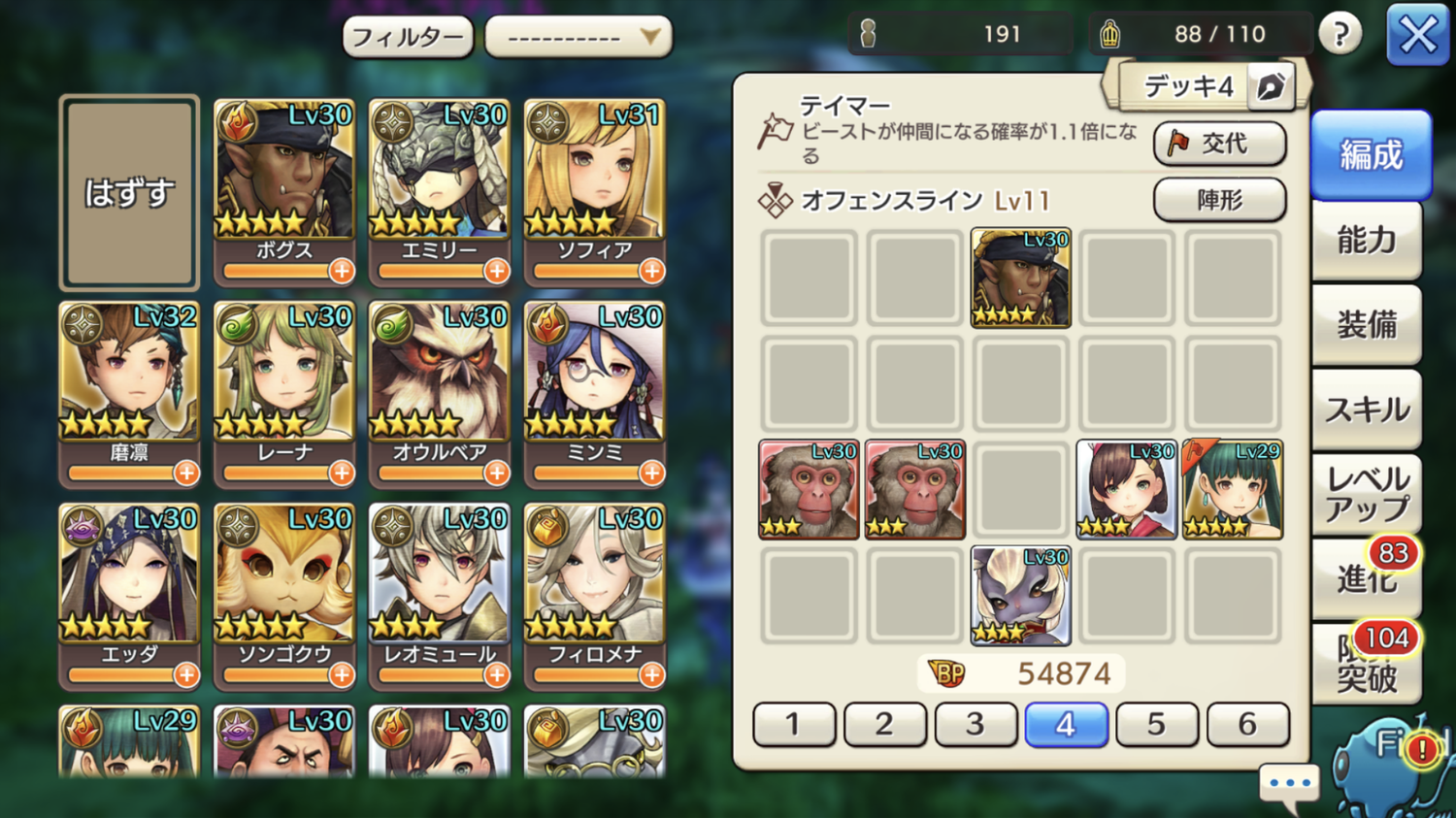 タンクは死なずにすむように成長しました。まぁ、性能アップしたアロティのおかげもあるけど…。が、しかしぃ、火力が足りません。1番削れた編成が、ボグス、アロティ、ミンミ、ロロミュ、アメリア、エッダで65%くらいで、全然ダメでした。で、やっぱりググってみましたら、どーやら“猿”がいいみたいだったので、ボグス、猿×2、アロティ、ロロミュ、アメリアでアタックゥ〜!