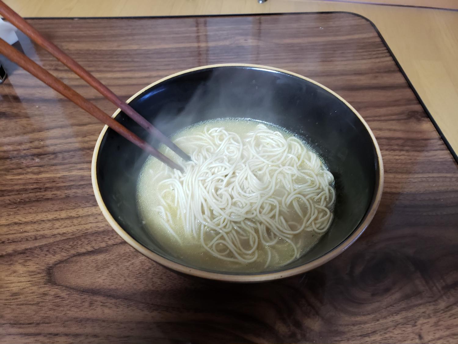 ところで、素人作成の豚骨スープは、炊き出し時の固形物しか濾していないので、コラーゲンも脂もMAXに残ってます。麺は小麦由来で、基本硬麺で上げます。やちょーは腸が弱めです。何が言いたいかというと…