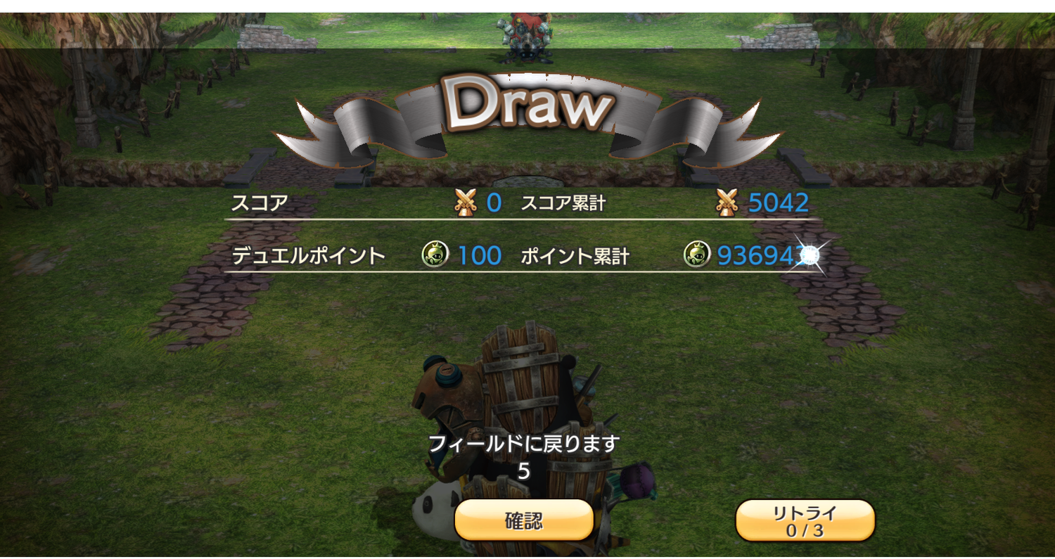 2026/03/21 09:53 公開 デュエルの初めての形のドロー デュエルで、タワーの削れ具合とか、キャラバンの削れ具合が同じって言うドローはまあまあ、あるのですけど、キャラバンが同時に壊れてのドローは、なかなかデュエルはやってきたのですけど、初めてです、こんなことあるんですね^^ アイネスフウジン リンクをコピーしました 前の旅日誌 旅日誌一覧 次の旅日誌 コメント