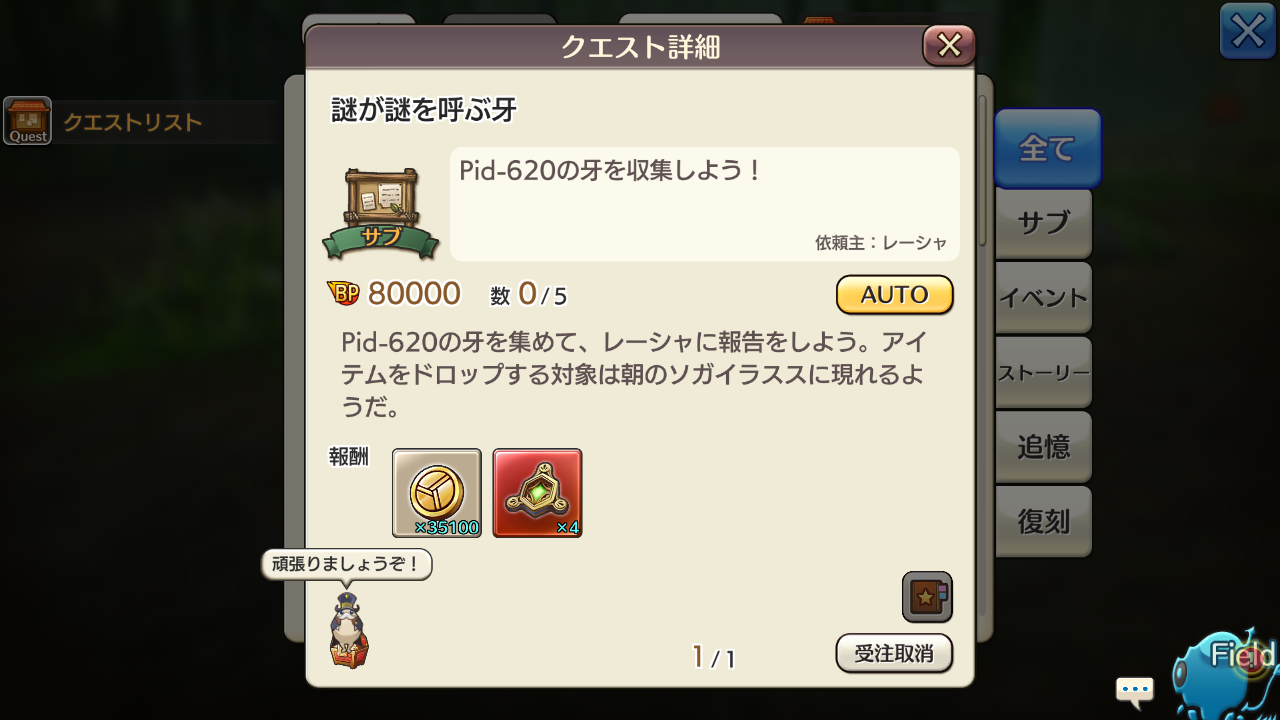 2021/02/07 20:54 公開 Pid-620の牙を集めるクエストどうしてますか? 雑日誌 スクリーンショット おはこんにちばんは~^^Pid-620の牙を集めるクエスト何ですが・・・なんかこうサクッとクリアできる方法ないですかね?今年の正月のドラゴンで出て来るかな~って思ってたら出なかった。進化したら突然変異でシャヴォンヌになるとかでもいいけどね(知らんけど)牙を集める人はひたすら放置なんですかね? ちくにん リンクをコピーしました 前の旅日誌 旅日誌一覧 次の旅日誌 コメント 1 ディアージュ ID: ty7km3iv4p6p イヌとかの★1の牙素材を集めて、合成でランダムに作成すると比較的楽です。 2021/02/07 20:57 2 cross ID: kwf9e3prdimy 自分は合成で作りましたよー 2021/02/07 23:26 3 アドル ID: xu54mv56imga リポップの時間が長すぎたので…小さな牙系を合成しました。特定の素材を集めれば確定で作れるシステムがあればいいんですけどね~ 2021/02/08 01:11 4 ちくにん ID: ip2n2tnu4bei >> 1 (人''▽`)ありがとう☆やってみます~ 2021/02/08 09:17 5 ちくにん ID: ip2n2tnu4bei >> 2 ありがとうございます! 2021/02/08 09:19 6 ちくにん ID: ip2n2tnu4bei >> 3 (੭ु´・ω・`)੭ु⁾⁾ 2021/02/08 09:19 7 ✽LeCiel✽ ID: t36aadnt6b6c まずテイムがだな... 2021/02/09 10:28 8 ちくにん ID: ip2n2tnu4bei >> 7 今なら誰もいないからch移動しながら狩り放題だよ!!ぎびだんご投げ放題だよ!!\(゜ロ\)(/ロ゜)/ 2021/02/09 21:38