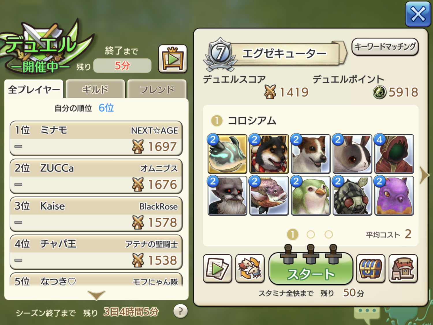2018/03/31 09:19 公開 ☆5にしたビーストの強さ事例紹介_3 雑日誌 攻略 デュエル スクリーンショット ビーストだけでどこまでやれるのか、デュエルで検証しています。そこそこ良い結果が得られているので共有してみます〜現在、スコア1400まで上がってきました。もう少し上まで行けそうかなと感じています。スコア1500の相手も倒せたので、週末にどこまで行けるかチャレンジ予定〜ビーストの可能性を少しでも感じていただき、好きなビーストを見つけて育てるキッカケになれば幸いです。個体値が導入されましたが、ビーストオンリーの私のデッキ強化になったのでウマウマですw ギャラクシー リンクをコピーしました 前の旅日誌 旅日誌一覧 次の旅日誌 コメント 1 きの ID: yq9cigh9zbxt 圧倒的低コストデッキ笑なんかカードゲームでありそうww 2018/03/31 09:22 2 きなこもち ID: e8iy5nrf3s2k すごすぎです!!ドワーフゾンビとブルーギルって、使ったことがないのですが、強いのですか? 2018/03/31 09:33 3 ラットル(皐月) ID: 6i8hc4tidab4 初めまして(´∀`)めちゃくちゃ育てていますね!私もビーストのみでデュエルを始めたので、目標にはせて頂きます(*´꒳`*) 2018/03/31 11:14 4 リフル ID: phf5sqigtsr3 こんにちは(´∇`)相変わらず凄いデッキです(^^)この前似たデッキの方にウミウシを沢山出されてボコボコにされました_(:3」∠)_ 2018/03/31 11:52 5 天音 ID: xunskeu8c2nj 凄いよくここまで育てましたね!ヴァラ鯖で同じような順位取れたら確証を得られそうですねd( ̄  ̄) 2018/03/31 14:33 6 グラニフ ID: 4zdetbgasqy3 ビーストデッキ!夢がありますね(^_^)/ 2018/03/31 14:46 7 ギャラクシー ID: qvqf4bb543bh >> 2 コスト2ビーストでは強いと思います。ドワゾンは、どこでも配置できることと、混乱スキルが特徴です。早めに配置して相手の氷結砲の盾になってもらうか、遠くに配置して歩かせていつでも混乱スキル出せるようにしてあげると非常に強いです。ブルーギルは拘束が強力です。特に守りで力を発揮します。氷結効きにくいロンバルドやギルガバの対策に重宝してます。また、ペンギンの氷結が切れるころに追加で拘束、とやると長時間相手を停止できて強力です。どちらもオススメですよ〜 2018/03/31 23:22 8 ギャラクシー ID: qvqf4bb543bh きのさん私も最初は平均コスト2wwwと思ってましたが、意外と強いですよ〜おためしあれこころさん確かこころさんもビースト☆5にされていたかと思います。ビーストの強さを広めていきましょう〜皐月さんビーストは育てるほどに愛着が湧いてきますよね!一緒に頑張りましょう〜(=´∀`)人(´∀`=)リフルさん☆5ウミウシは戦況をひっくり返す強さがあります。ウミウシ☆5にした後、デッキからマルバスがリストラされましたw筋肉祭Locaさんデュエルは他の鯖の人とも当たるみたいです、見たことないスコアや名前の人と対戦になることあります。交流のチャンス!と思って全力で対戦してます!グラニフさんビーストデッキは夢があります!全ビーストを☆5にしたら、もっと強くなる、そう思ったら育成に力がある入ります〜 2018/03/31 23:38 9 きなこもち ID: e8iy5nrf3s2k なるほど、拘束と混乱が強いんですね!詳しく教えてくださってありがとうございます。ビースト好きとして密かに応援しています! 2018/04/01 13:24