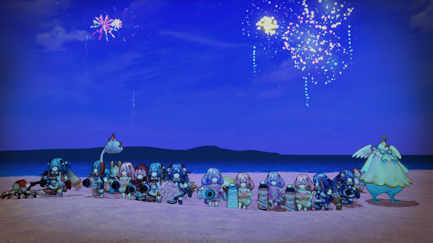 で、不具合で不満の嵐が吹き荒れた後には、まさかのサプライズイベントが用意されていました。 いやー、一年半くらいキャラストをプレイしていて、ここまで粋な計らいはなかったんじゃないでしょうか。 お得感満載の屋台と、綺麗な花火! 当然やりました、記念撮影。 今年はコロナ禍で現実の花火もなかった、という現状を含めて、本当に楽しませていただきました。 強いて要望を言うとすれば、魔獣出現時のように空を見上げられるようにして欲しかったです。 頭上に輝く花火、撮りたかった。