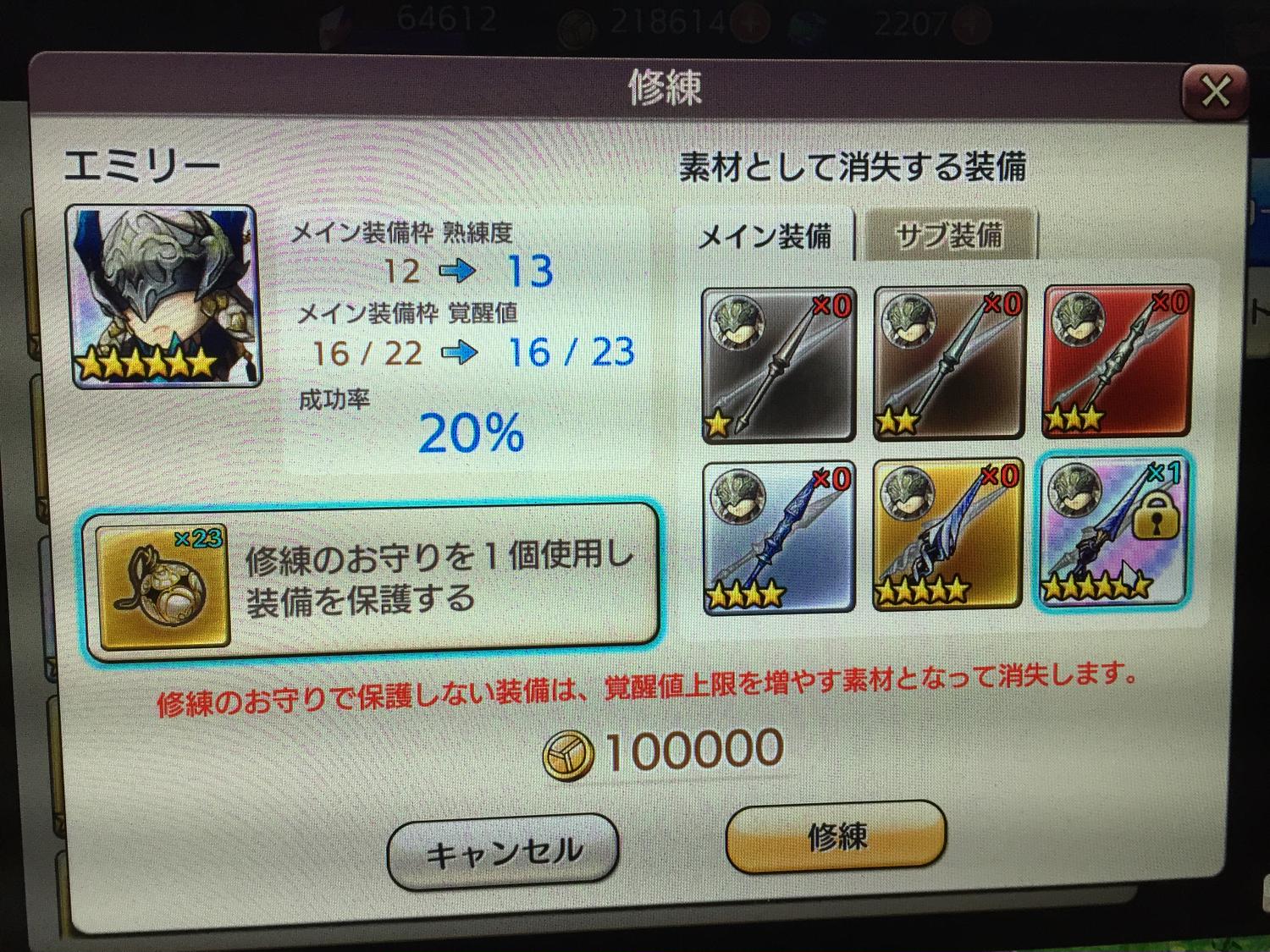 過去に☆5装備の修練40%で10回連続失敗(11回目に成功したのではなくそこで止めた)というのがあり、お守りが足らなくなる事態となりました。