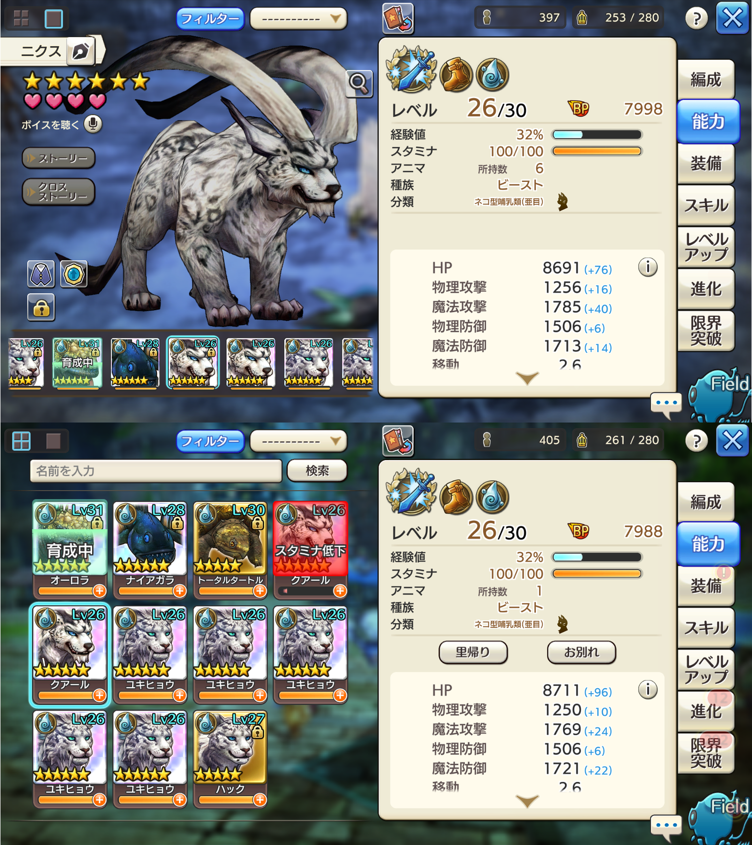 ステータス的には完全にクアールがユキヒョウの上位互換。ただしクアールには魔法攻撃力アップのパッシブがありませんので完全に育ち切れば火力面では似通った数値に落ち着きそうな感があります。後は好み次第、と言う感じでしょうか。