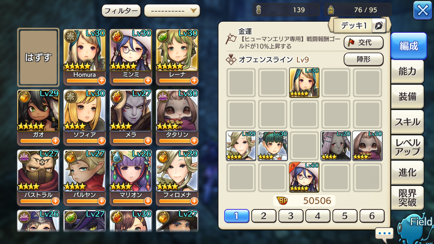 ⑥モーガ :☆4 Lv20 M5/S2 強化なし スキル3/3/1/1/1
