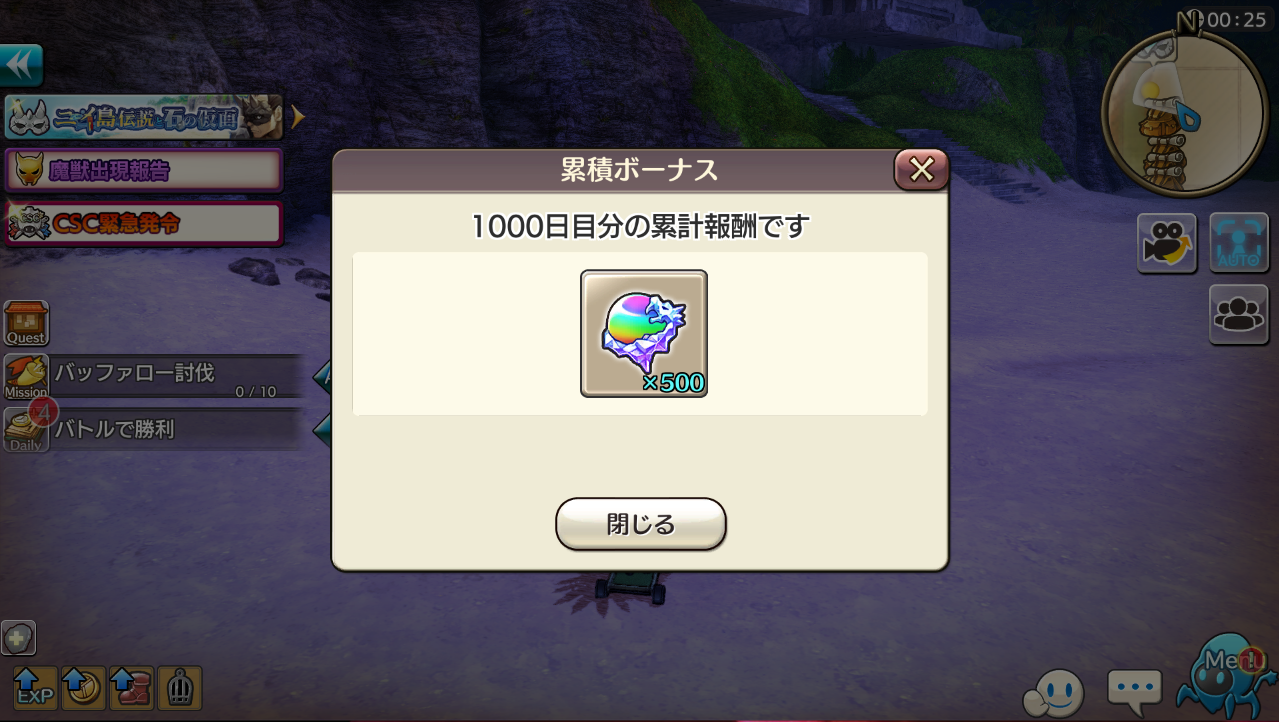 昨日のお話ではあるんですけれども、ログイン日数1000日目ボーナスというのが出現しまして。