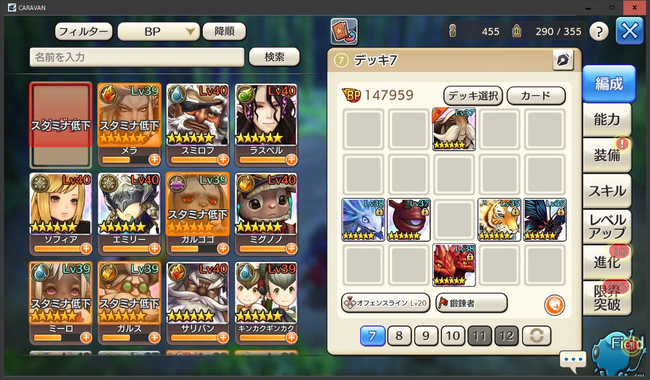 編成画面でキャラをはずすボタンの上にスタミナ低下の表示が重なっています。この不具合はキャラの名前検索をした後によくおこるのですが、この状態でキャラの入れ替えをすると名前検索をした状態に戻ってしまいます。再現しようとしたのですがうまくいきませんでした。もしお気付きでしたら修正をお願いします。