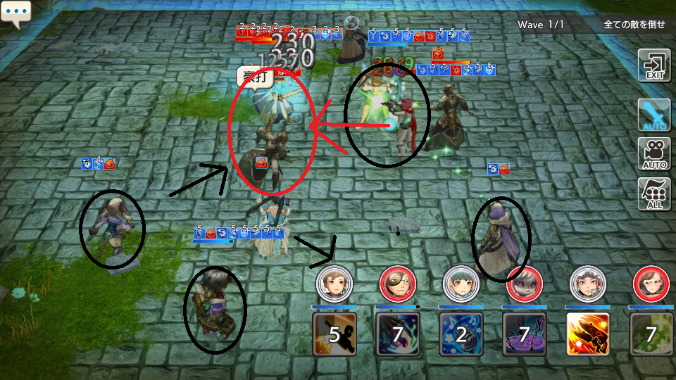 (6)左3体を倒したら、ラルミミは上の魔法使いにタゲして、右にいた敵をヒューマンアバターが引っ張って上(魔法使いの横)に運ぶ。