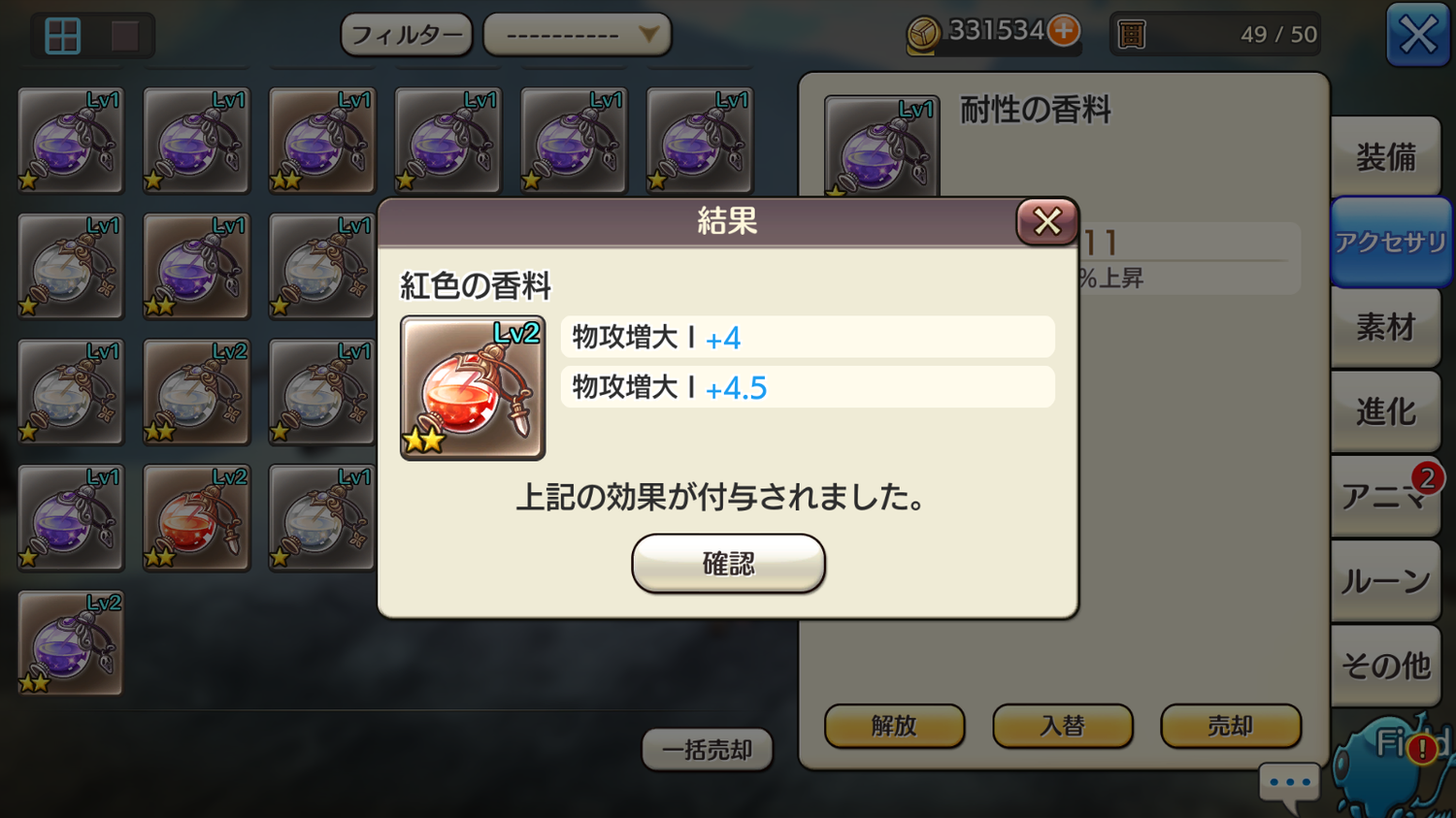 私が今回やった画像のは、2つアクセサリーを用意してその2つのアクセサリーの効果の中で、効果を入れ替える「入替」ってやつだよ♪どの効果が残るかはランダムだから、賭けでもある~(。>д<)