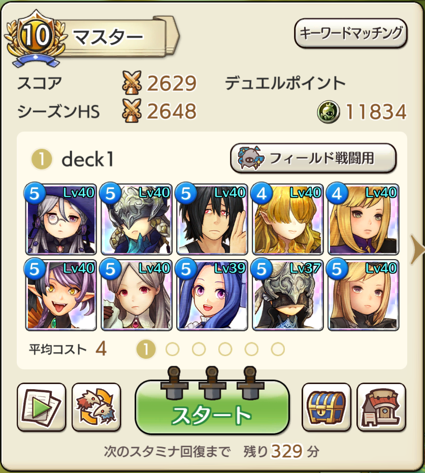 デュエルは最近の改修で初期ランクが過去最大スコアを基に算出される様になったものの、スタミナ切れでもデュエルでスコアランクが変動する仕様が未だに健在なので、結局「即ギブ格下狩り」や「マッチング開始直後にキャンセルボタン押下による格差マッチング」が主流なのは相変わらずという…