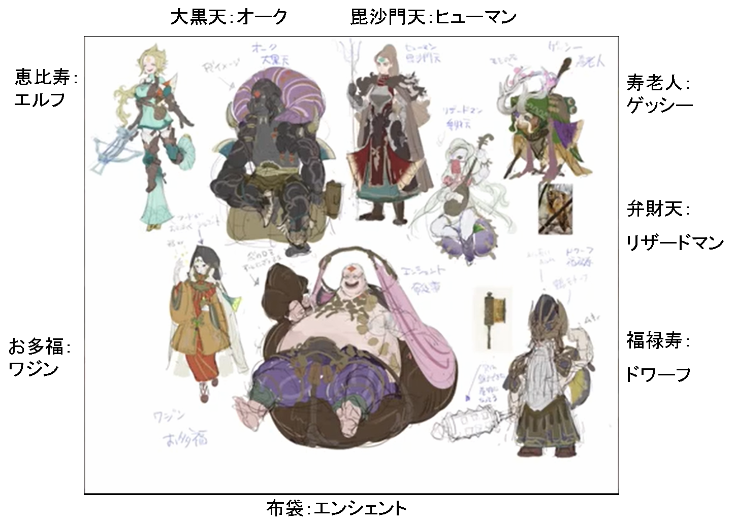 キャラストではお多福を加えて8種族8柱としていますね。以下解説。