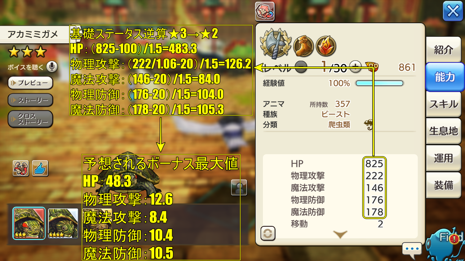 素体は★3です。通常エリアの嘆きの泥土だとテイム率が渋すぎてなかなか集まりませんが今なら復刻エリアにいますので狙い目。ボーナス値予想は図鑑から逆算です。
