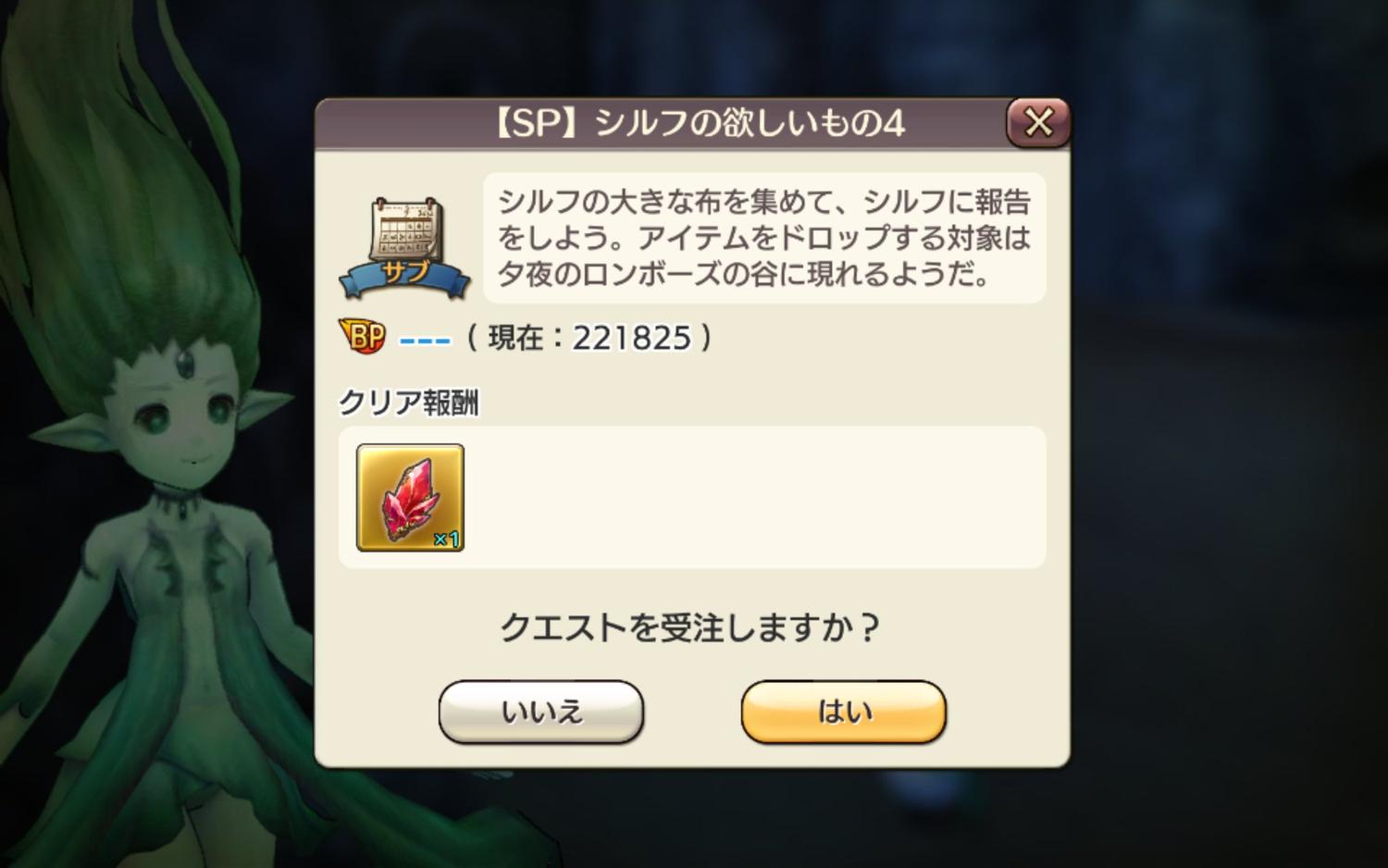 このあとシルフの欲しいもの5でエキドナの大きな布を1000、欲しいもの6のクエでマルバスの星6サブ装備を30個納品するらしいです