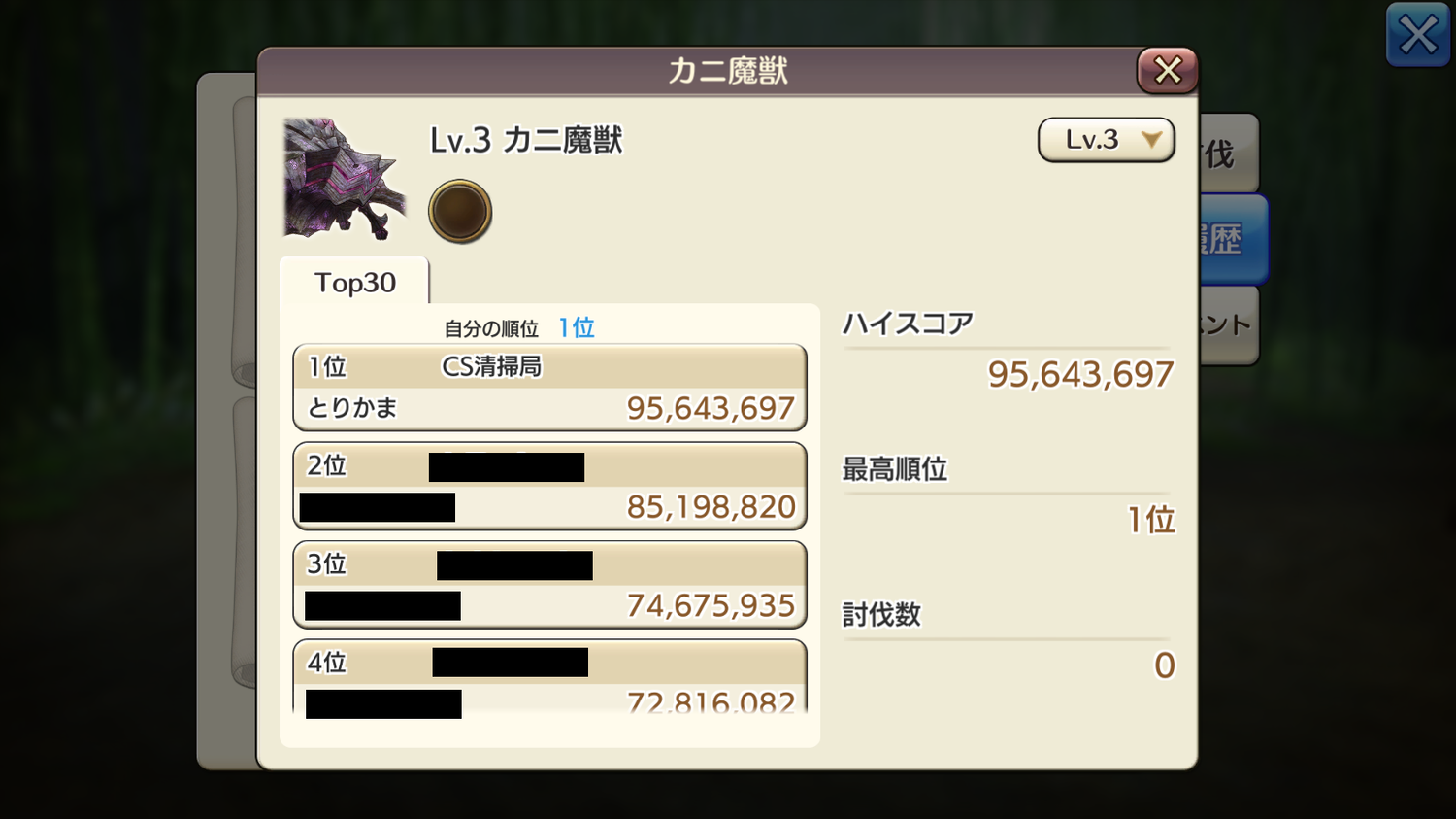 この度Lv3カニ魔獣で100回1位を達成しましたので無事称号を取得できました。