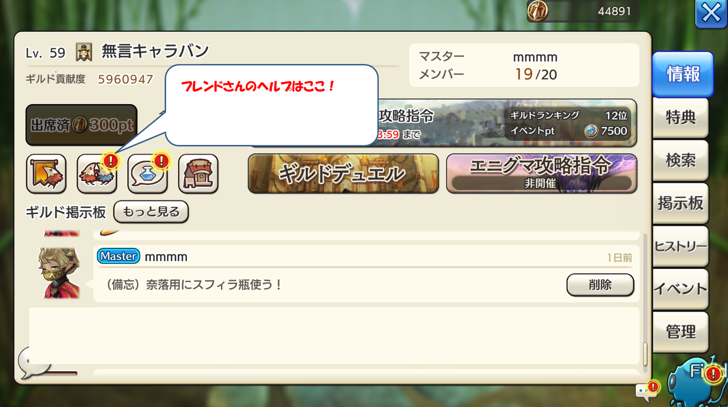 ギルド画面→ヘルプのアイコンで手伝うとフレンドさんが助かりますよくコ:彡