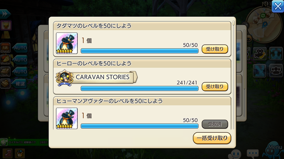 ようやく、全キャラ(コラボ除く)241人のレベル50達成できました~。