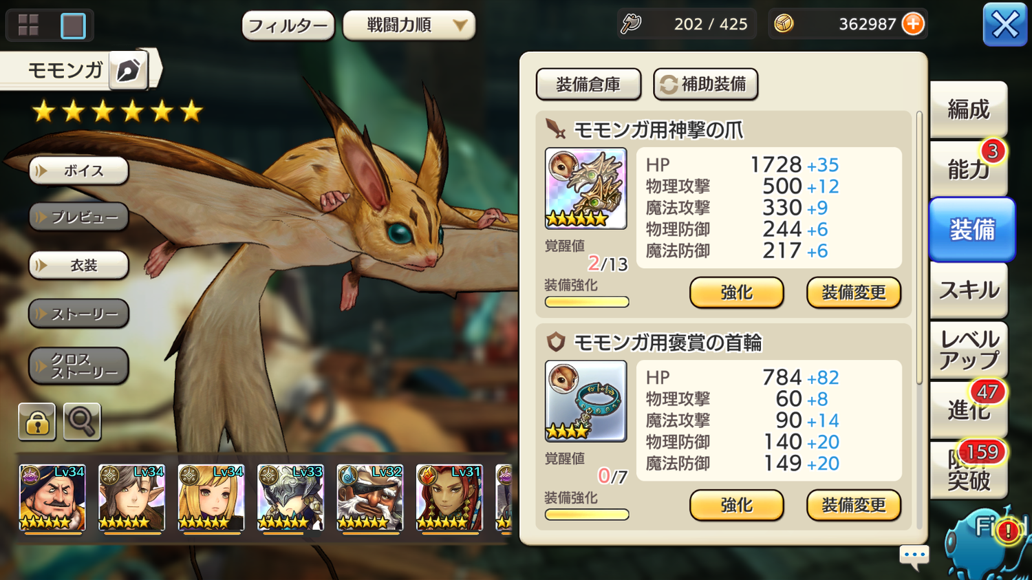 キャンペーン対象で、たまたま☆6装備を片方いただけたこともあり、モモンガちゃんを進化させました(スクショ1枚目)。