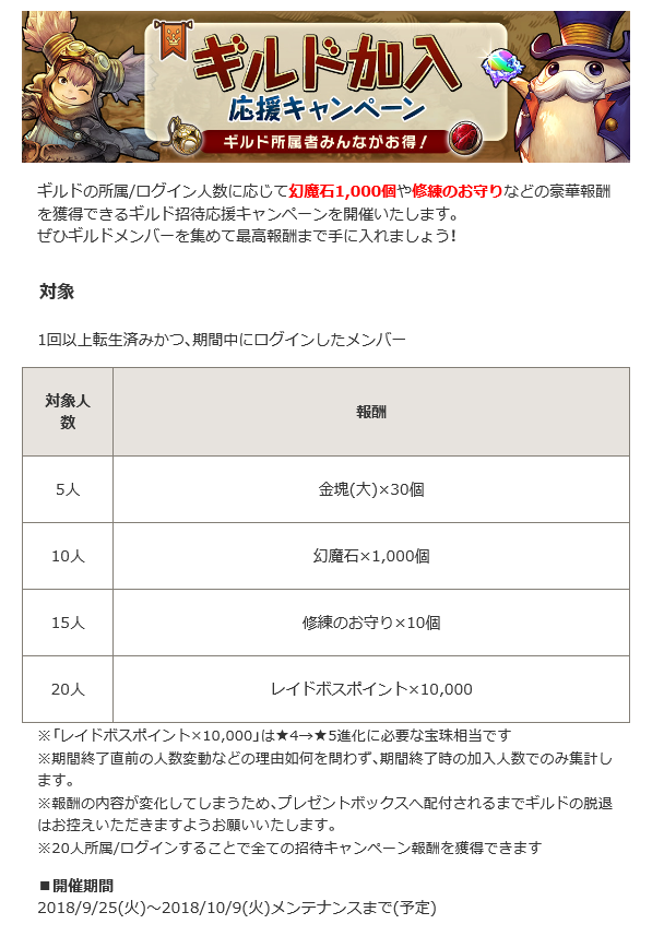 今、下記のギルド加入キャンペーンをやってるいるので初心者さんもギルドに入ったほうがお得になりますよ