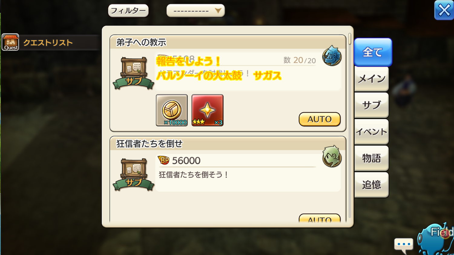 サブクエストが完了になりません 万事急須 ID: 9ipbfkirgwhd スレッド作成者 2019/01/28 13:16 「弟子への教示」サブクエストが、達成報告可能となったままで表示が消えません。