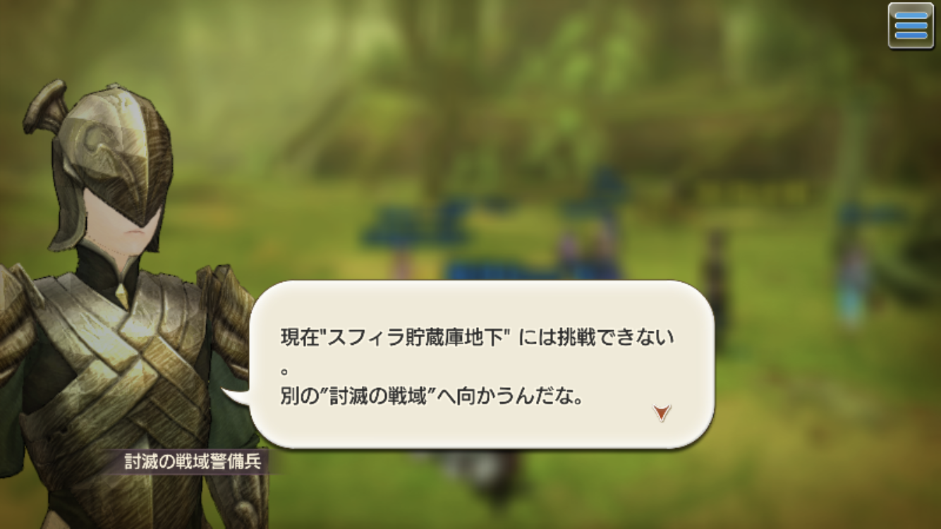 ギルドでスフィラ貯蔵庫の討滅の戦域に行っていたので参加しようとしましたが、画像の状態になり何度話しかけても同じ、別開催地のロシュショールの塔に行っても同じ現象でした。