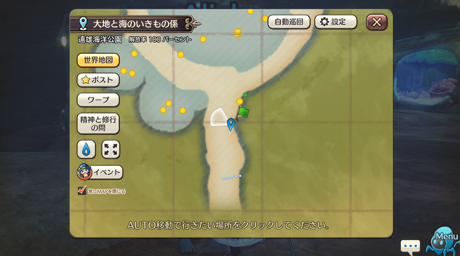 大地と海のいきもの係 イアルの冒険者 リント ID: d7esh547pskg スレッド作成者 2020/09/24 22:54 サブクエスト よりどりみどりのオーシャンパーク「遠雄海洋公園」のみOUTモードにしてあるが、キャラが動いてくれない。視界の中で緑の旗が動いてしまう。