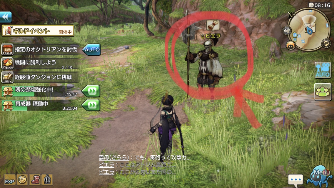 ガルメニア地方の、アトリム高原の入り口の近くにいる騎士?のピエラの上にクエストマークが出ているのですが、話してもクエストか、プレゼントどちらも出て来ないです。