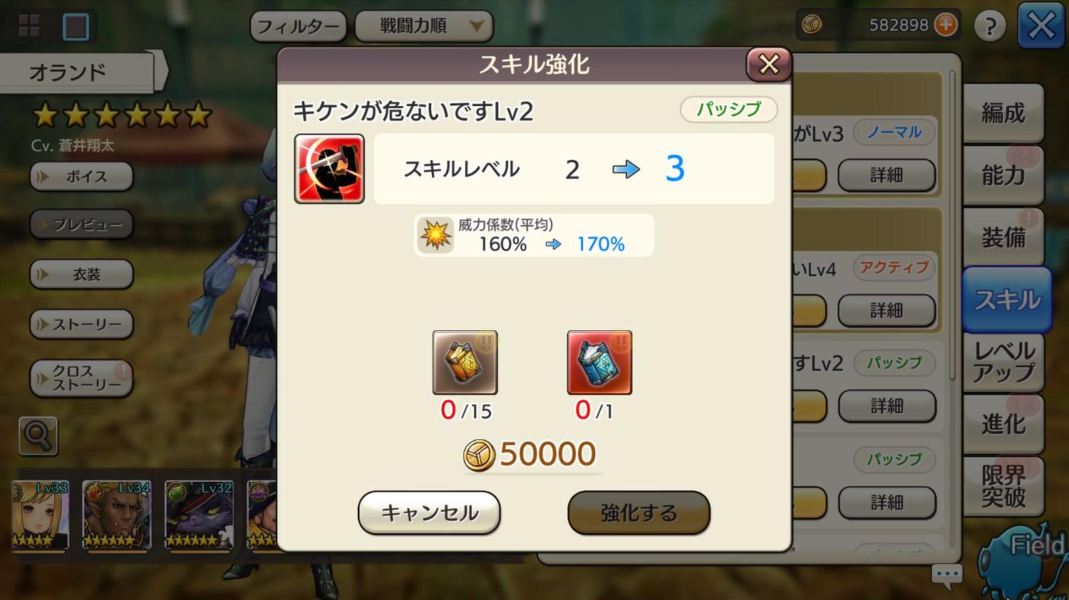 先ほどオランドのパッシブスキル「キケンが危ないです」のスキルレベルを2から3へ上げようとしたところ、「 skill leverlup」の表示は出たものの、スキルレベルは上がっていませんでした。